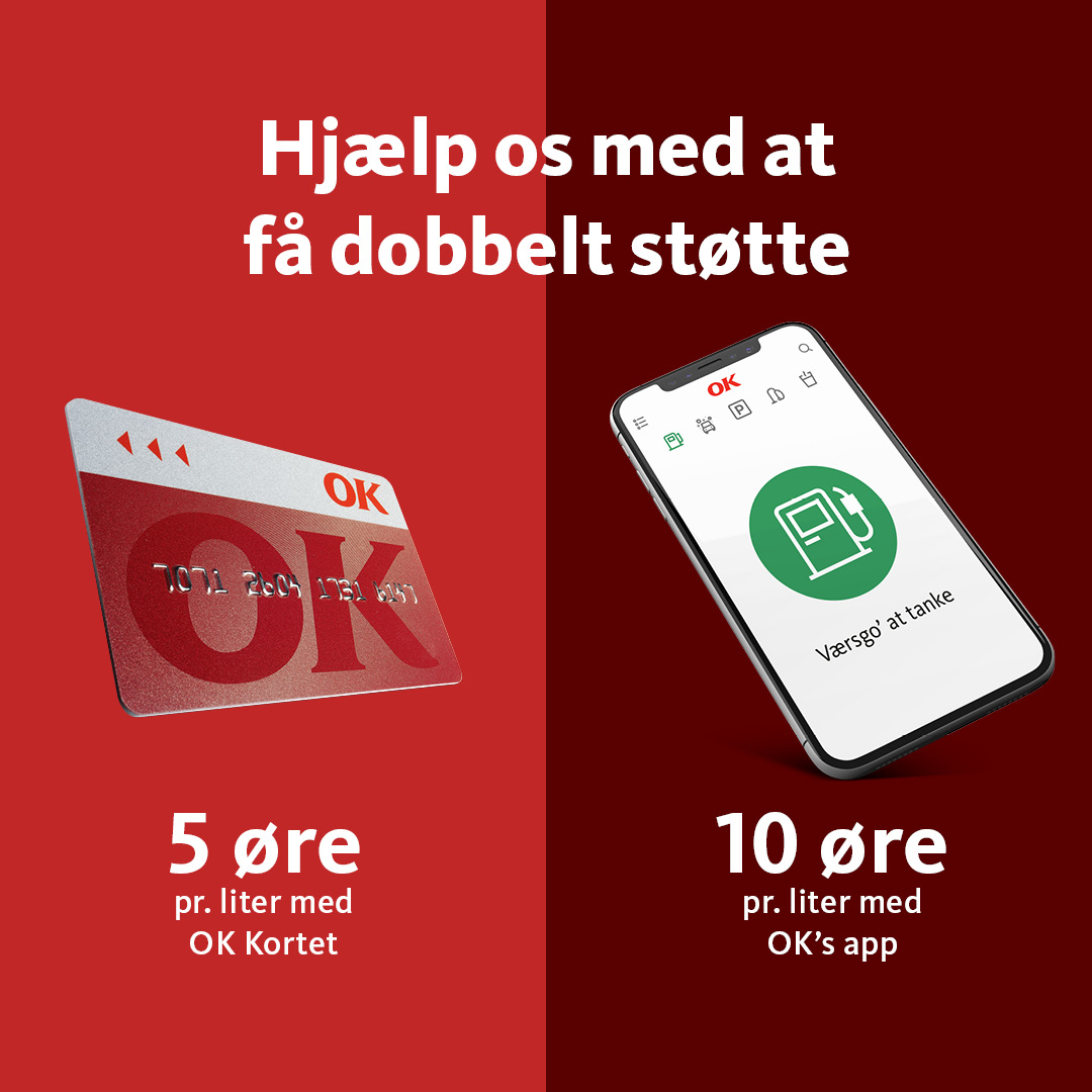 Faktisk støtter du klubben med 5 øre per liter, hvis du anvender dit OK Kort, mens du støtter med 10 øre per liter, såfremt OK's app anvendes.